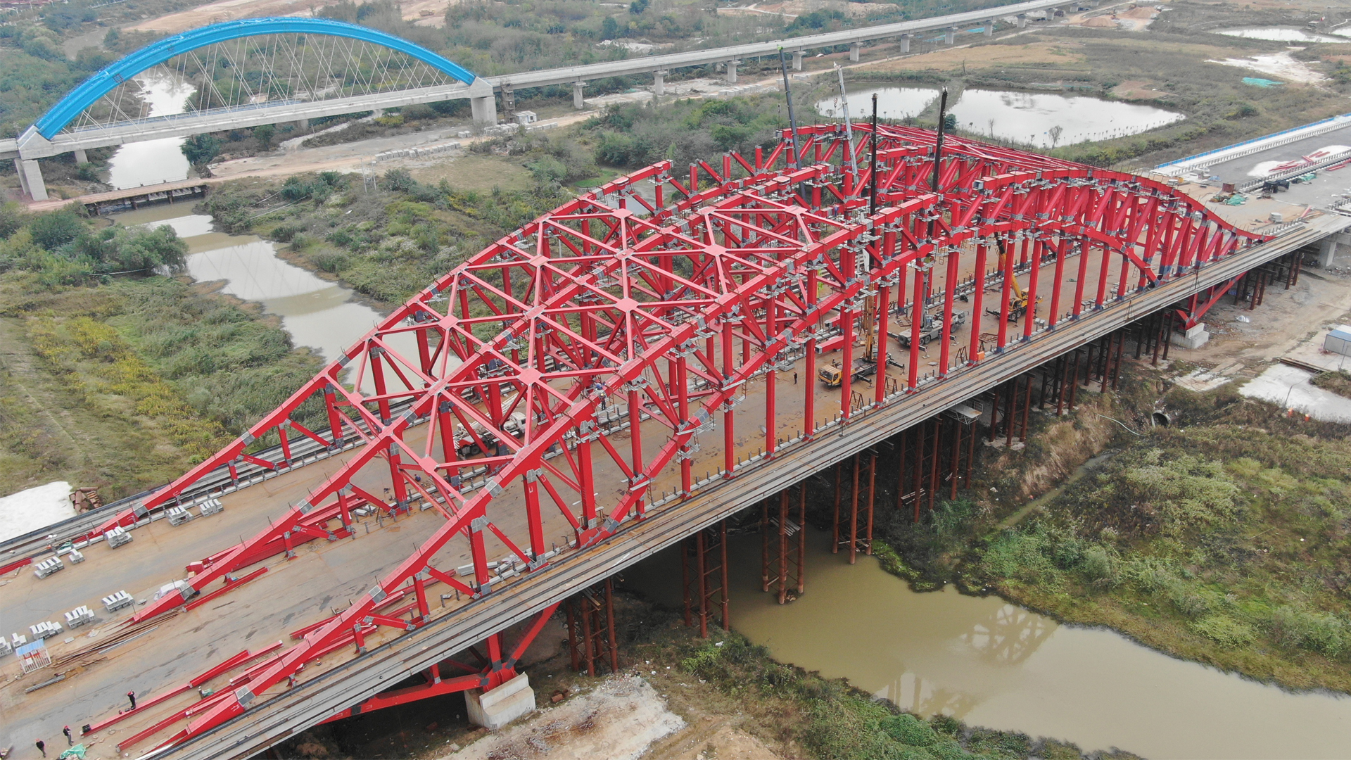? ? ? ?集賢路跨派河鋼桁拱橋位于安徽省合肥市肥西縣集賢路,工程北起方興大道,南至派河大道,長2.78公里,寬70米,設(shè)計為城市快速路。本橋鋼梁為三跨連續(xù)中承式鋼桁拱橋,鋼梁全長239.8m,上拱肋頂至橋面板高約36m,橋面板至支座高約12m,規(guī)劃三級航道。集賢路跨派河橋(方興大道~派河大道)工程完成后,集賢路將成為一條連接高新區(qū)、政務(wù)區(qū)、經(jīng)濟開發(fā)區(qū)與肥西縣的城市快速干道。
