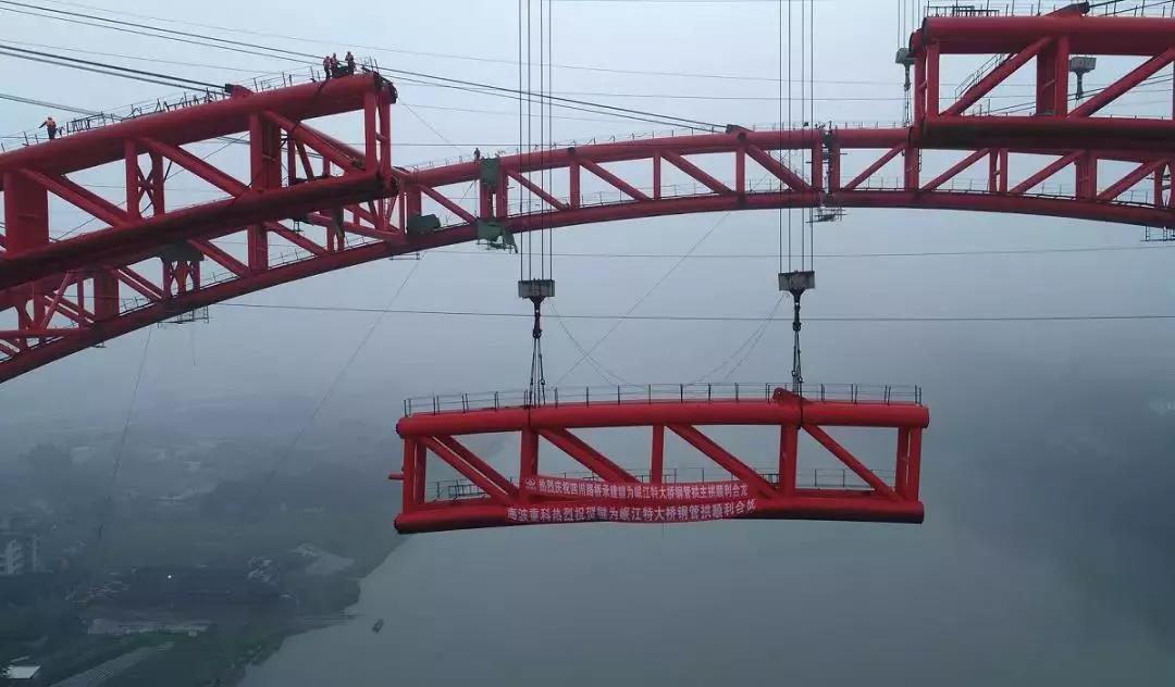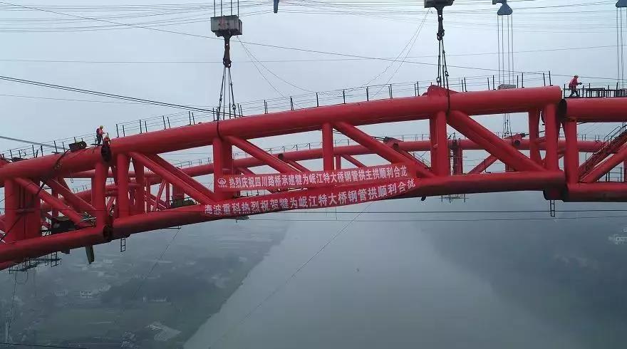(海波重科新聞報道)2020年1月15日,犍為岷江特大橋施工現(xiàn)場,只見高高的吊塔聳立岷江兩岸,纜索吊裝系統(tǒng)已準(zhǔn)備就緒;江面上,運輸船舶搭載著最后一段拱肋,將其運送到指定位置。“開始吊裝!”伴隨著現(xiàn)場一聲指令,拱肋從江面緩緩升起。經(jīng)過1個多小時的吊裝,上午10時42分,由海波重科承接的犍為岷江特大橋主橋457.6m鋼管拱橋,完成最后一段拱肋吊裝,實現(xiàn)了拱圈高精度合龍,合龍精度3mm,合攏應(yīng)力和全橋線形均滿足設(shè)計規(guī)范要求。