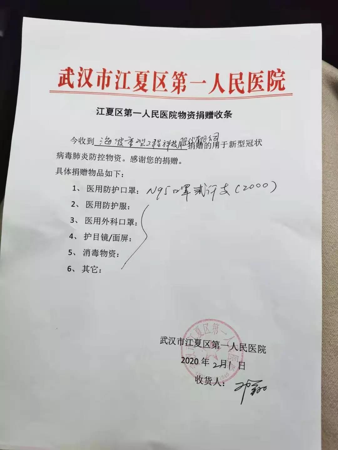 (海波重科新聞報(bào)道)一方有難,八方支援。為支援新型冠狀病毒肺炎疫情防控工作,2020年02月01日,海波重型工程科技股份有限公司向武漢市江夏區(qū)、武漢市經(jīng)濟(jì)技術(shù)開(kāi)發(fā)區(qū)(漢南區(qū))相關(guān)部門(mén)共計(jì)捐贈(zèng)現(xiàn)金及物資210000元,其中N95口罩2000只,定向捐贈(zèng)給武漢市江夏區(qū)第一人民醫(yī)院,為抗擊新型冠狀病毒肺炎疫情貢獻(xiàn)綿薄之力。