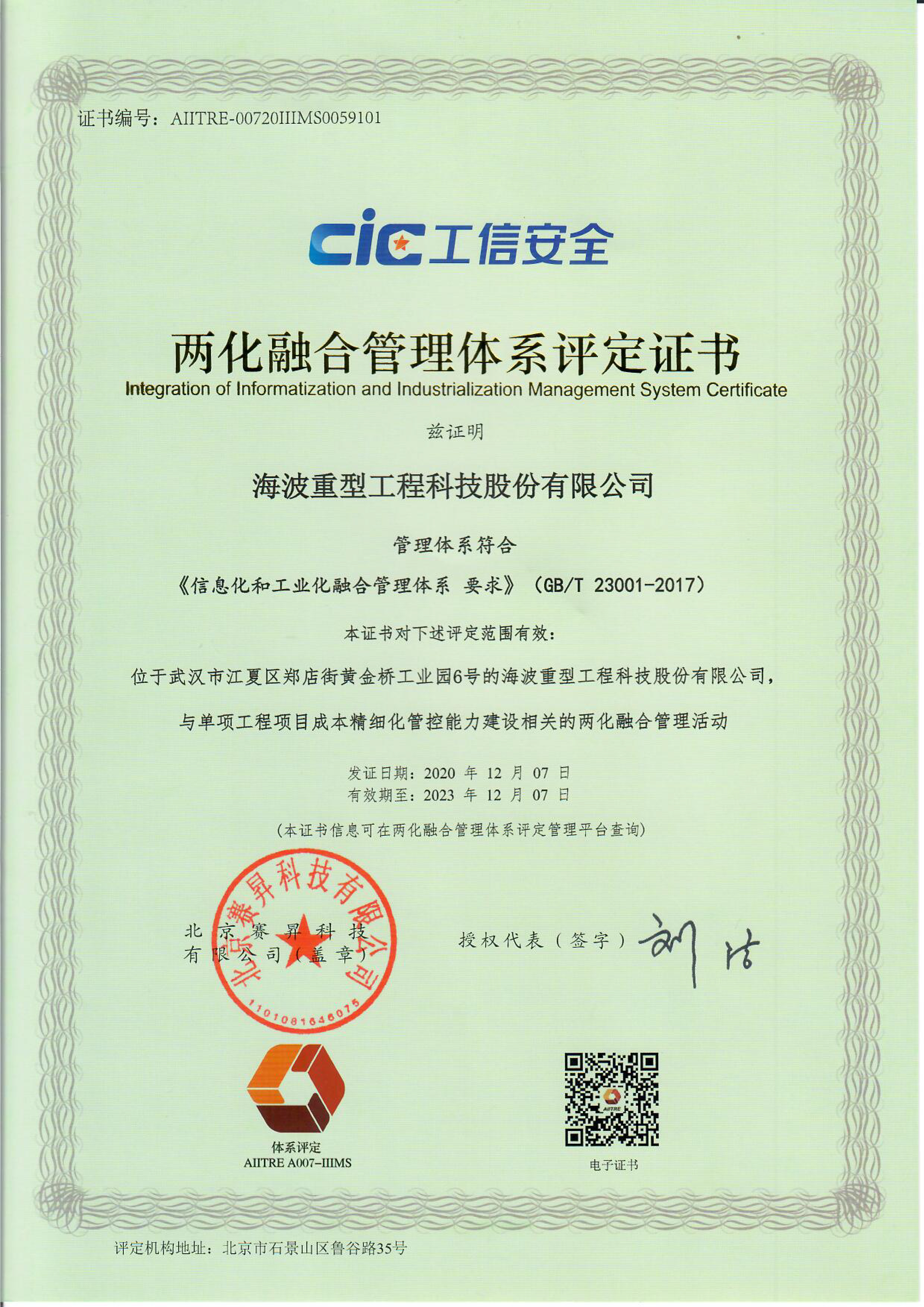 最終,經(jīng)國家工信部認可,我公司兩化融合工作符合國家兩化融合管理體系滿足標準要求,同意頒發(fā)“兩化融合管理體系評定證書”,標志著海波重科兩化融合管理體系貫標工作圓滿完成。